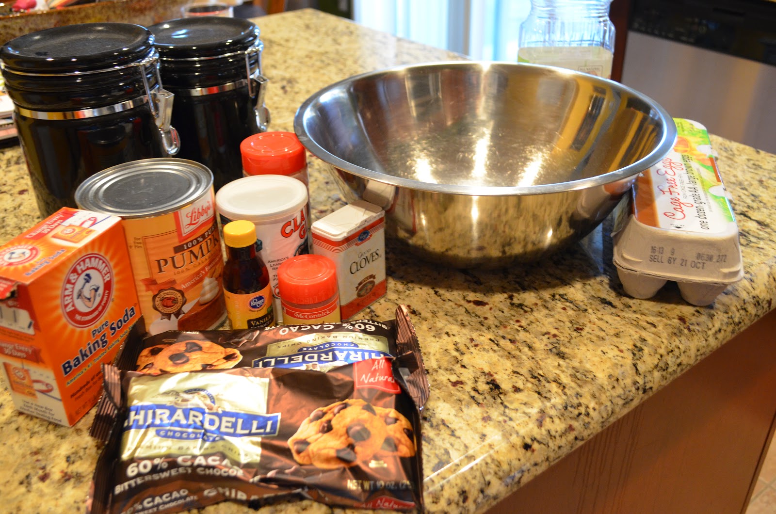 In a medium bowl, mix the flour, baking powder, spices, baking soda, and salt and set aside. Using a large mixing bowl and an electric mixer, mix the eggs and sugar until it smooths out and lightens slightly. Using a low speed setting, mix in the oil, pumpkin, and vanilla. Mix well. Add in the flour mixture in 2-3 small batches, mixing well after each. Mix in the chocolate chips.