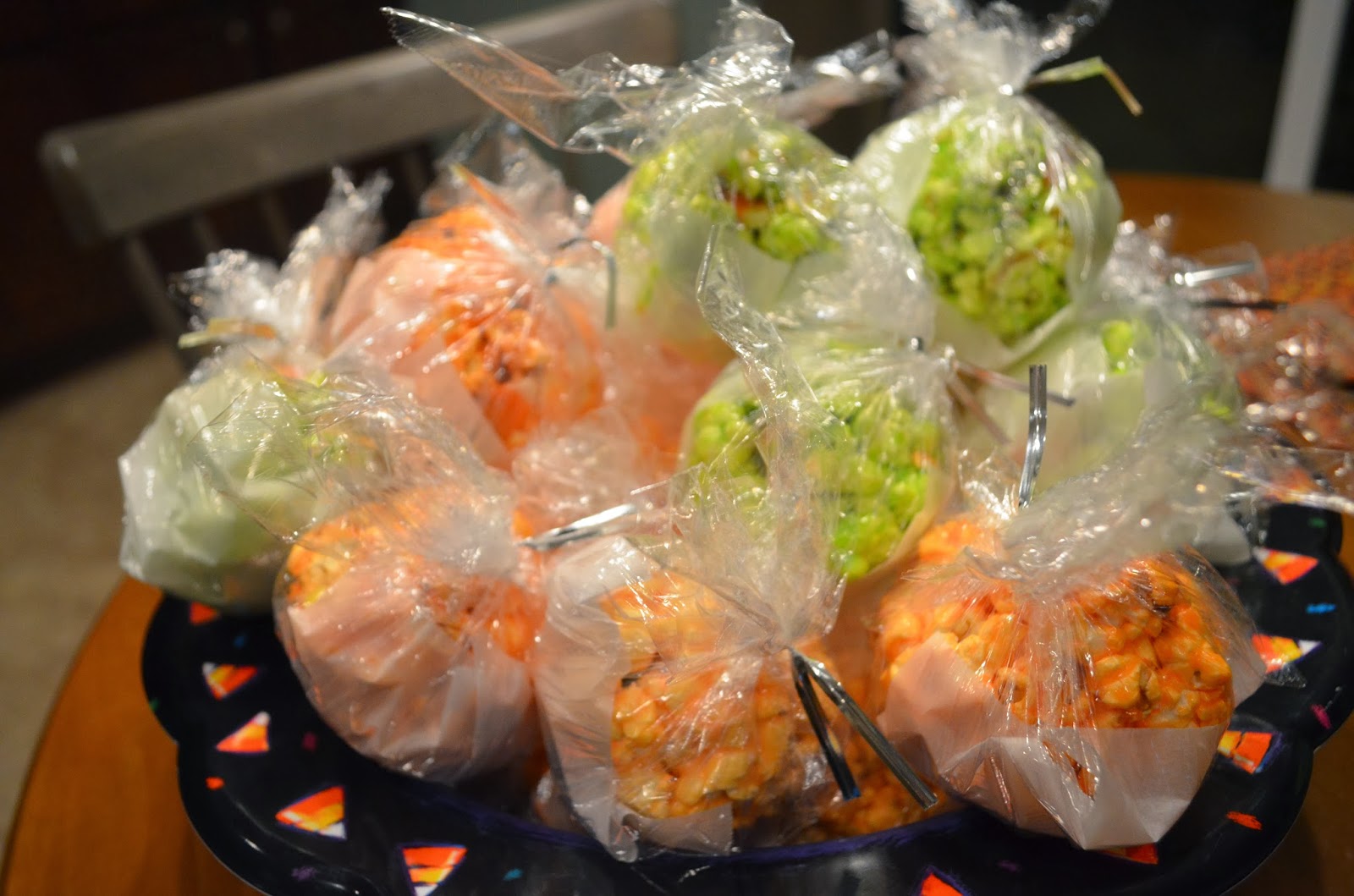 I have not had popcorn balls in forever! When one of the bloggers I follow posted this idea, I thought they would be the perfect treat to send with J to work tomorrow, on Halloween!