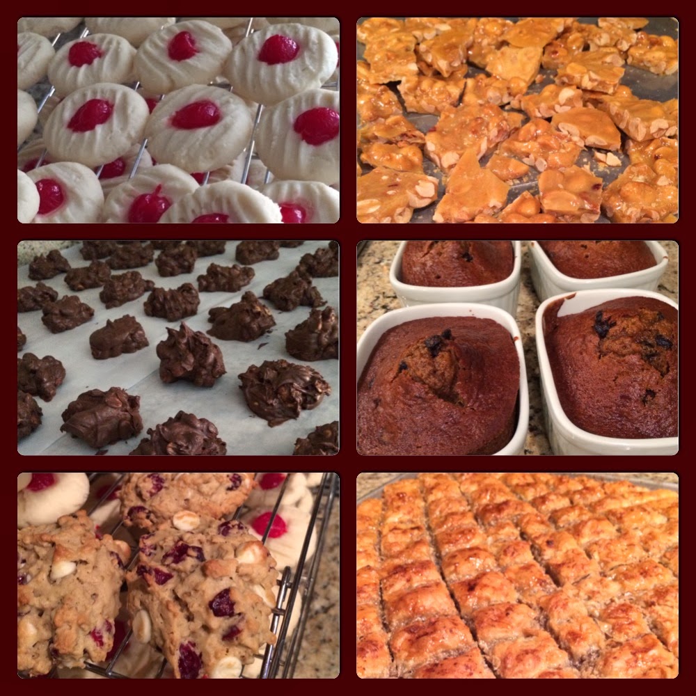 | Clockwise from Upper right: Peanut Brittle (recipe), Banana Chocolate chip bread (from a box, just added the bittersweet chips), baklava, cranberry oatmeal cookies with white chocolate chips (recipe on the back of every bag of original Craisens, and a link to it here), Christmas crockpot crack (recipe), shortbread cookies. |