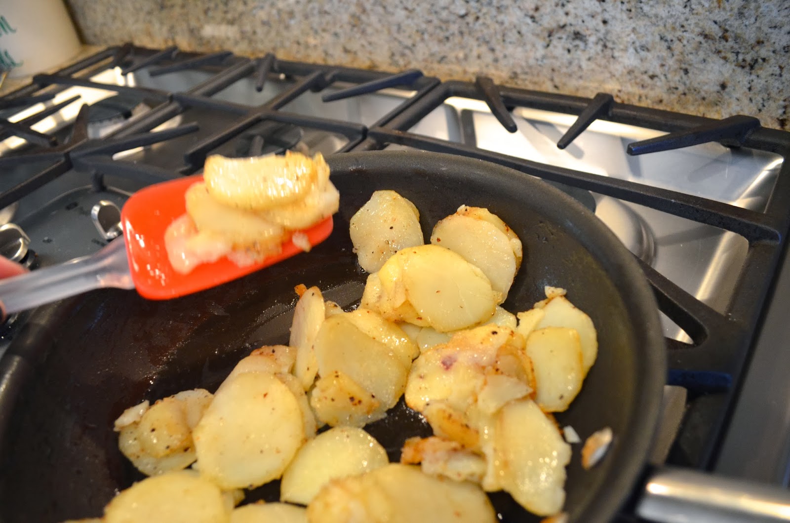 You can add some chopped onion if you have some and/or some peppers. Our fridge was pretty empty so my potatoes are alone. If you do use onion, just add it in with the potatoes. Anything else you might want to mix with them (eggs, sausage, bacon) is best cooked separately and then mixed in when they are both done cooking.