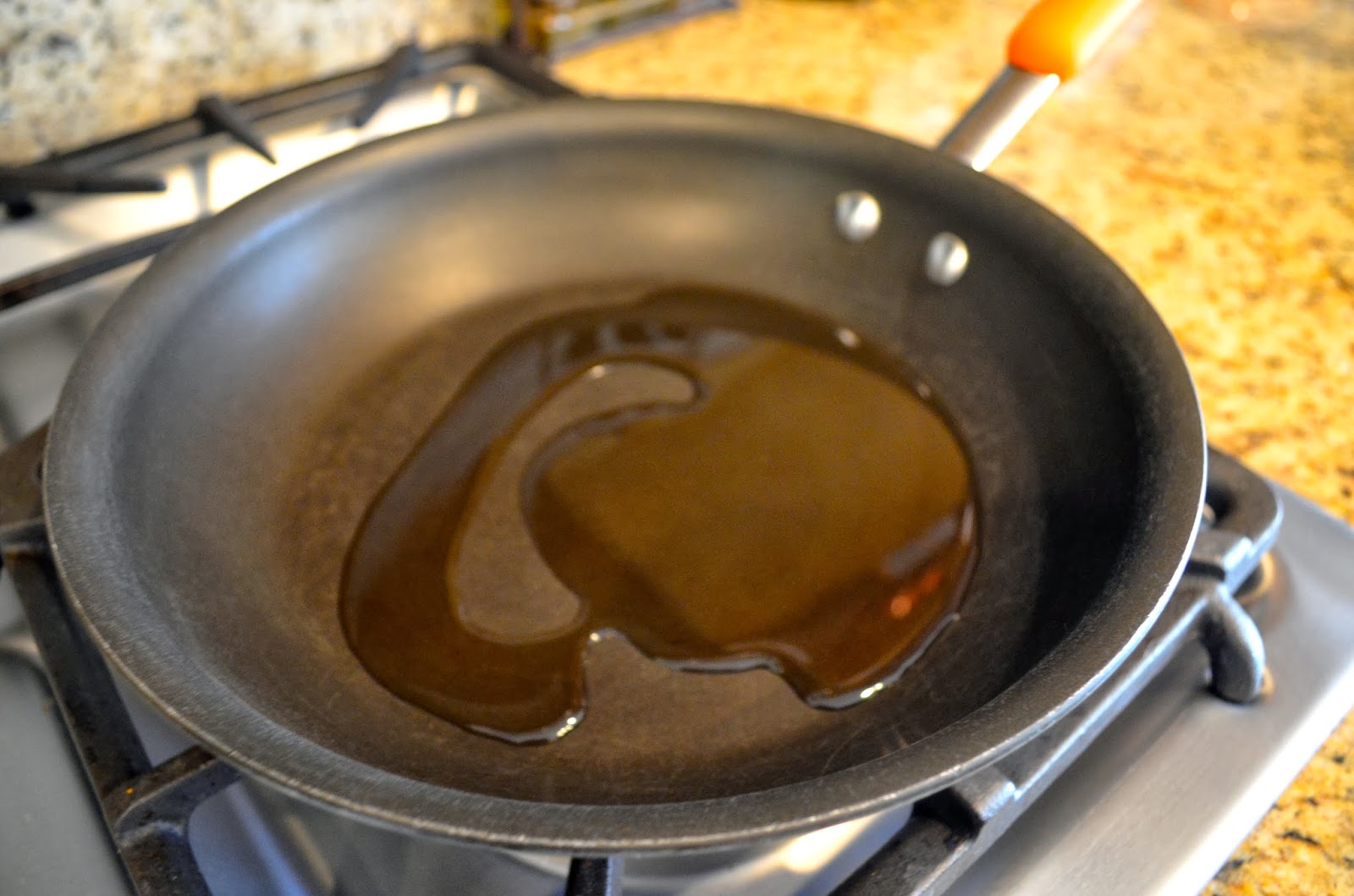I use extra virgin olive oil almost exclusively. I have canola for baking, and some non-stick spray, but other than that, it’s olive oil. The brand really doesn’t matter. There are variations in the taste, with the more expensive being more pure and smooth, but unless you are a foodie connoisseur, you would never notice. Just use whatever brand you want. Fried potatoes take a bit more oil than anything else I fry. This is about two tablespoons. Add the oil to your pan and turn the heat to med-low. So on my stove, the dial reads numbers so I set it to 3-4.