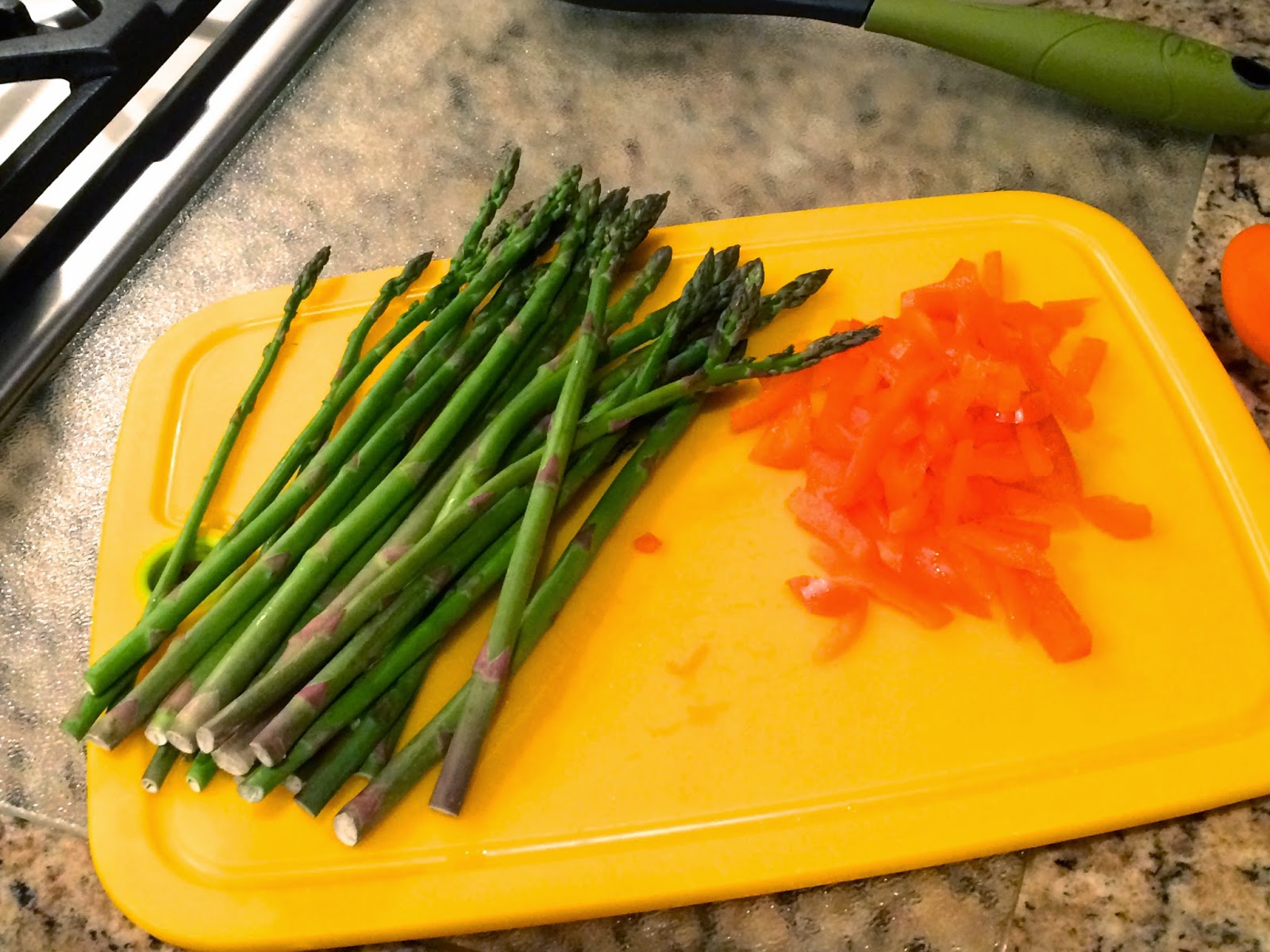 Wash your veggies and pat dry. Cut off the rough ends of the asparagus, then cut into bite-size pieces. Cut the pepper into thin slices, or just a rough chop. Chop the sundried tomatoes.