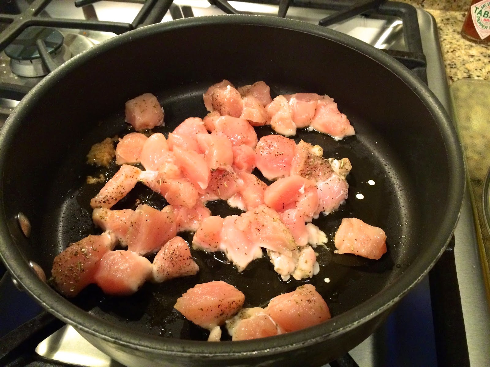 Meanwhile, using kitchen shears, cut up the chicken into bite-size pieces. You can use a knife of course, if you want, but I find that shears are much easier with mushy chicken! Season the chicken with S&P and Italian seasoning, as much or as little as you’d like.