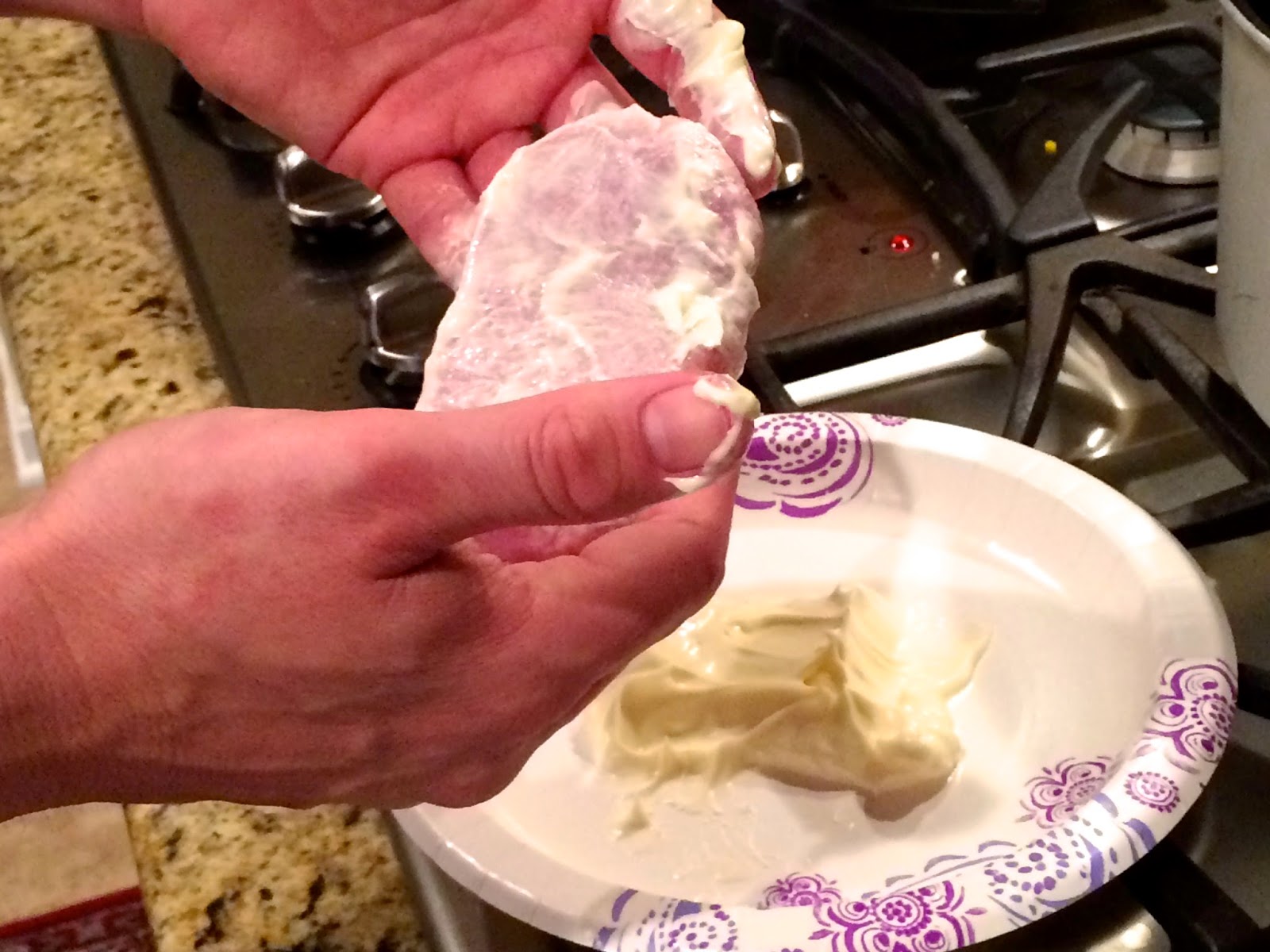 Spoon some mayo onto a plate and apply a thin coating to the pork chop. Please don’t just pull from your jar of mayo. Going back and forth from the pork to the jar will contaminate your whole jar! Just spoon some on a plate and use that. Toss the leftover. Let’s keep it clean!