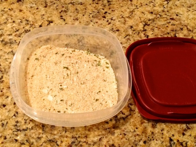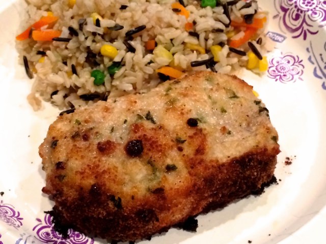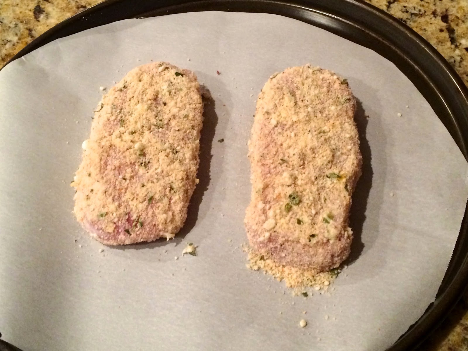 This recipe is really J’s fault! He volunteered to bake the pork chops one day and said “just tell me what to do.” So I told him mix a little bread crumb, a little parm, maybe some parsley….then he went to work.