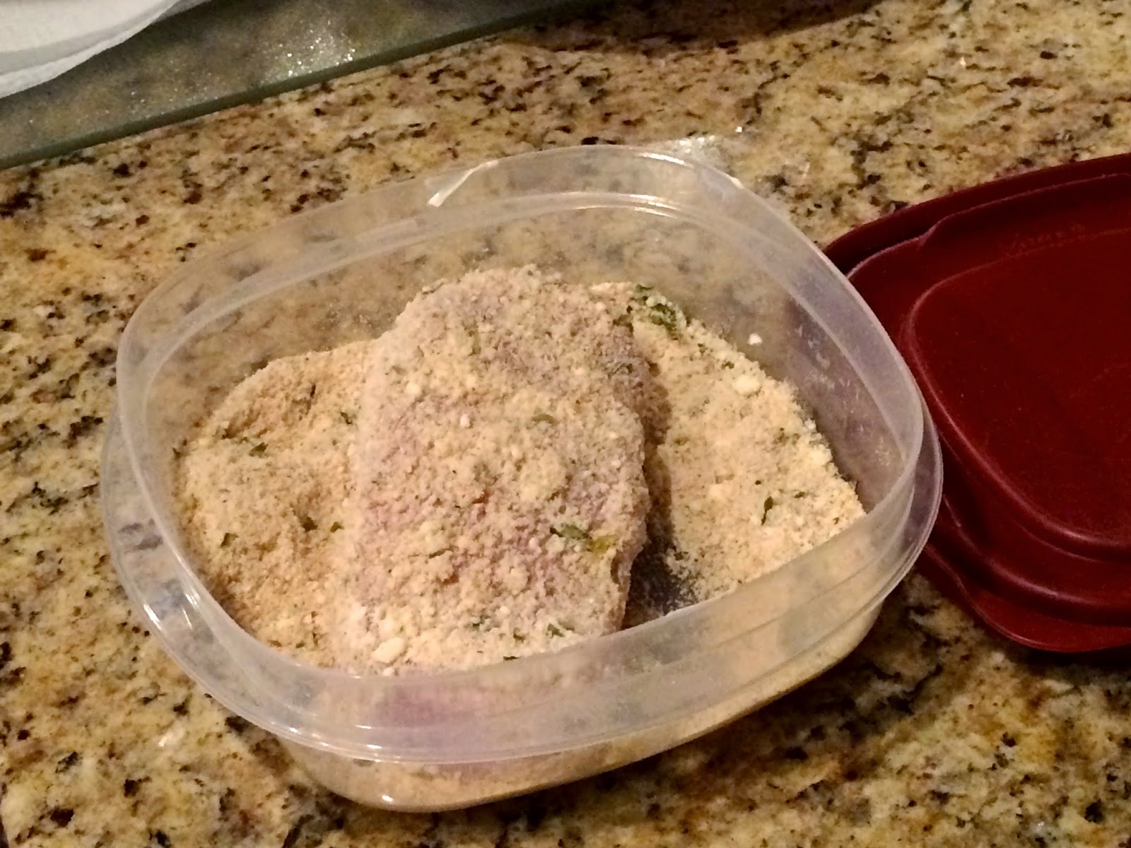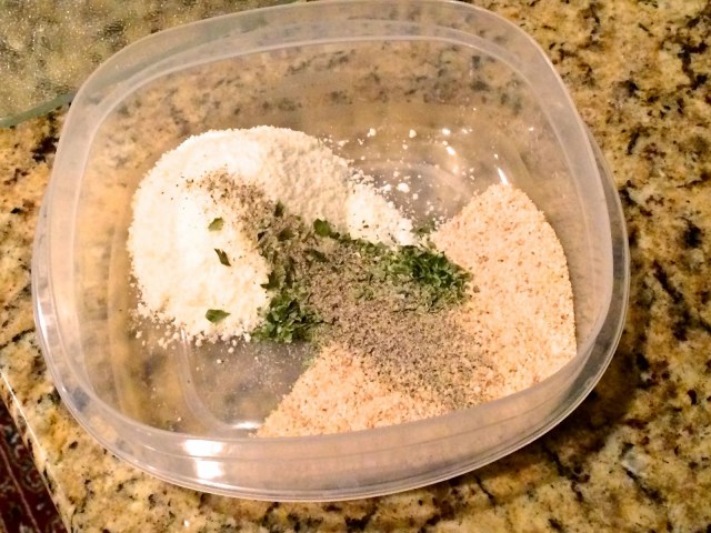 In a shallow bowl, combine even amounts of bread crumb and parmesan cheese. (About 1/4 C. each for 2 chops) Then add about a tablespoon of dried parsley, and salt and pepper. (Just eye ball it here. Use more or less to your taste. This is not an exact science!)