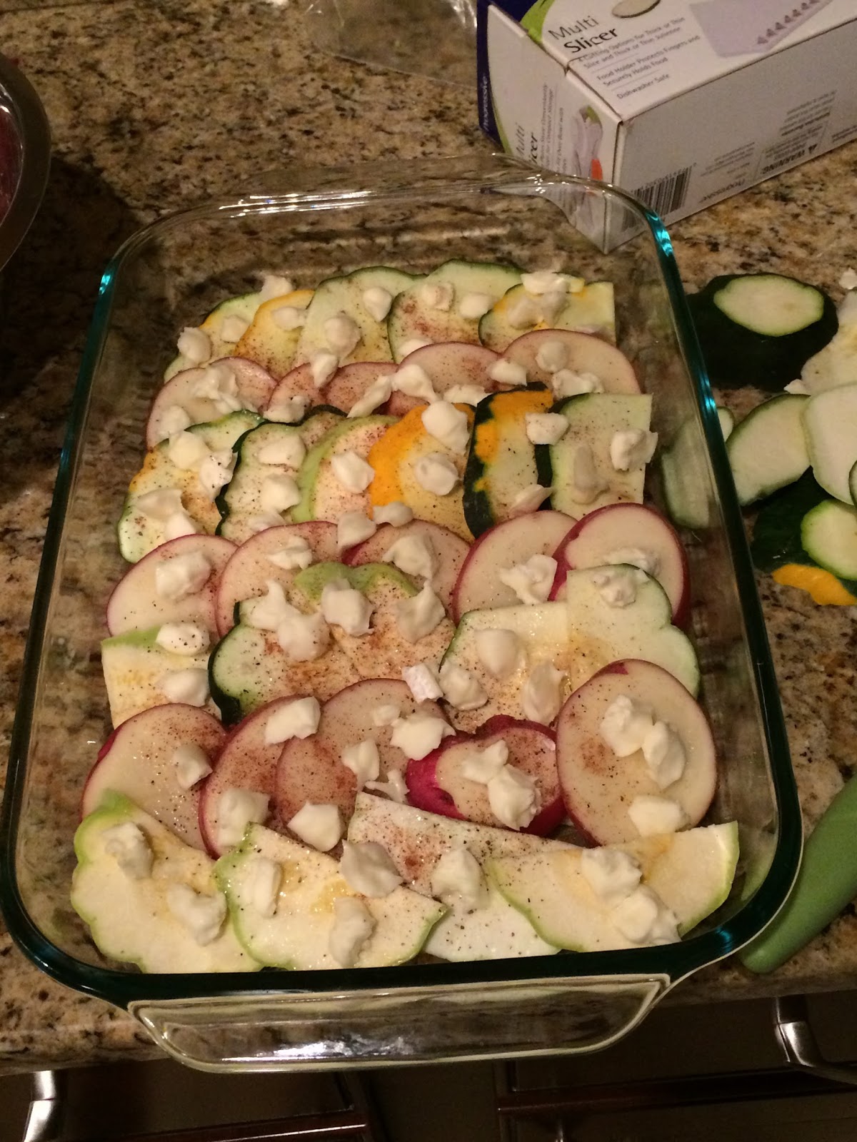 The first time we used pattypan, zucchini, and potatoes. Last night we just used pattypan and potatoes. Both were delicious!