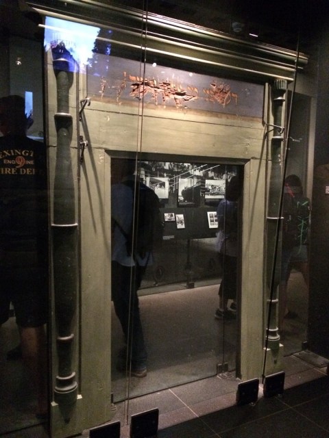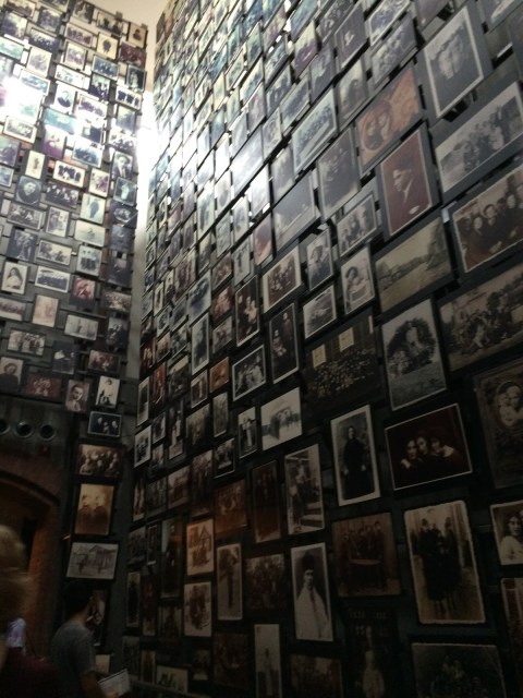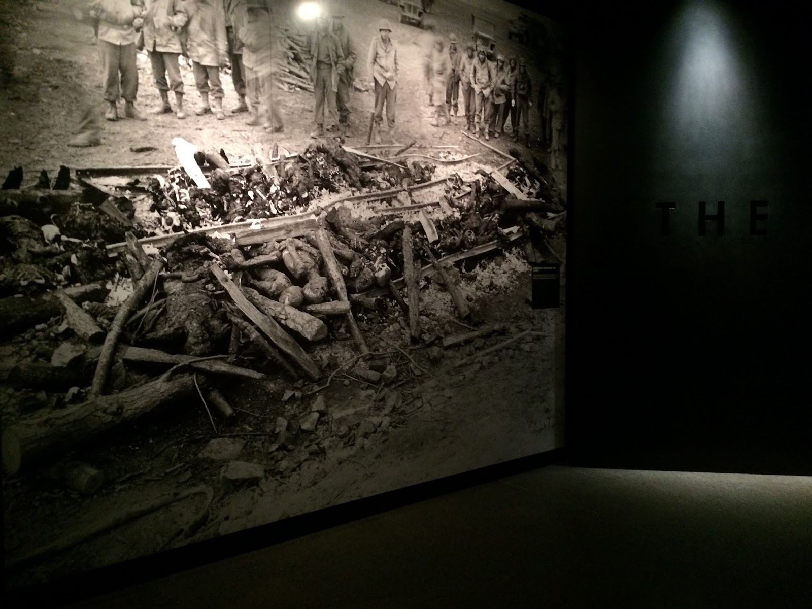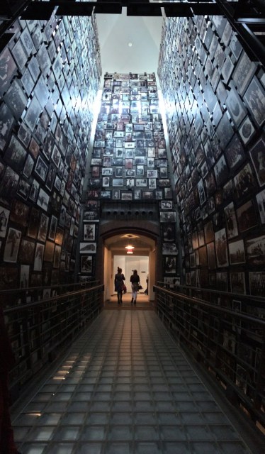 It all begins on the 4th floor. You are ushered like cattle into a big industrial-looking elevator that resembles a gas chamber. It holds maybe 20 people and it is packed full. As you ascend 4 floors, a voice track that is timed perfectly to the slow ascent gives you a preface for what you are about to experience. Everyone is silent. Then the elevator opens and you are confronted with the image below. An entire wall of sadness. And the journey begins.