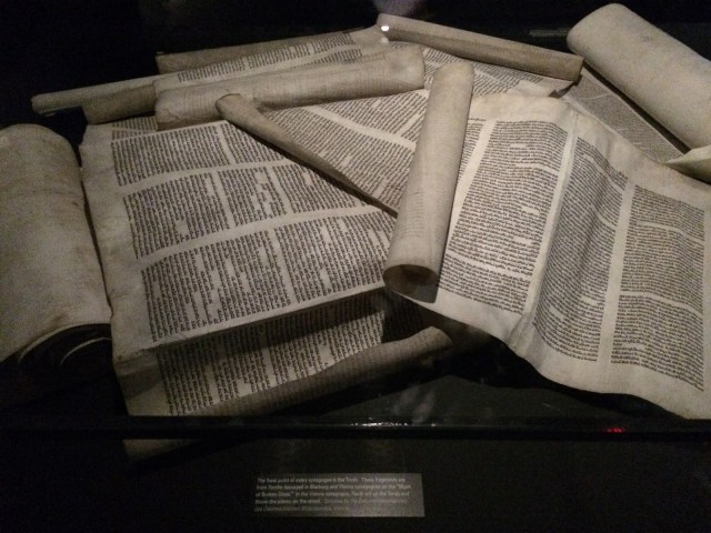 The remains of a Torah from a synagogue in Vienna that was destroyed on “The Night of the Broken Glass”