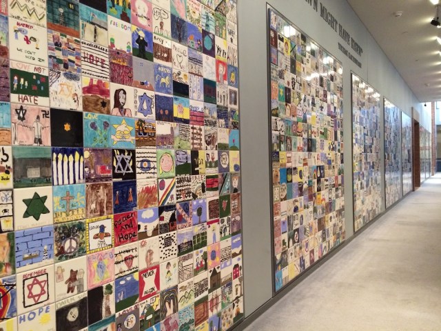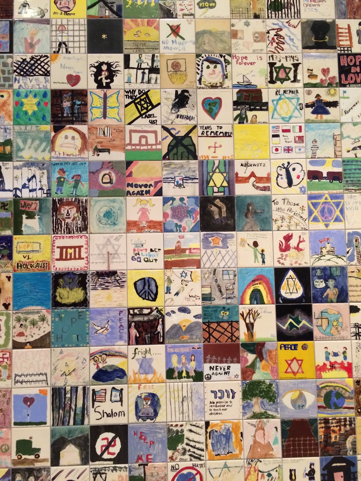 You will find the Children’s Tile Wall on the lower level (basement). It is a wall of ceramic tiles painted by children after hearing the story of the Holocaust.