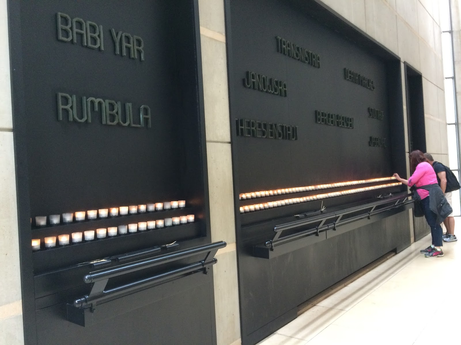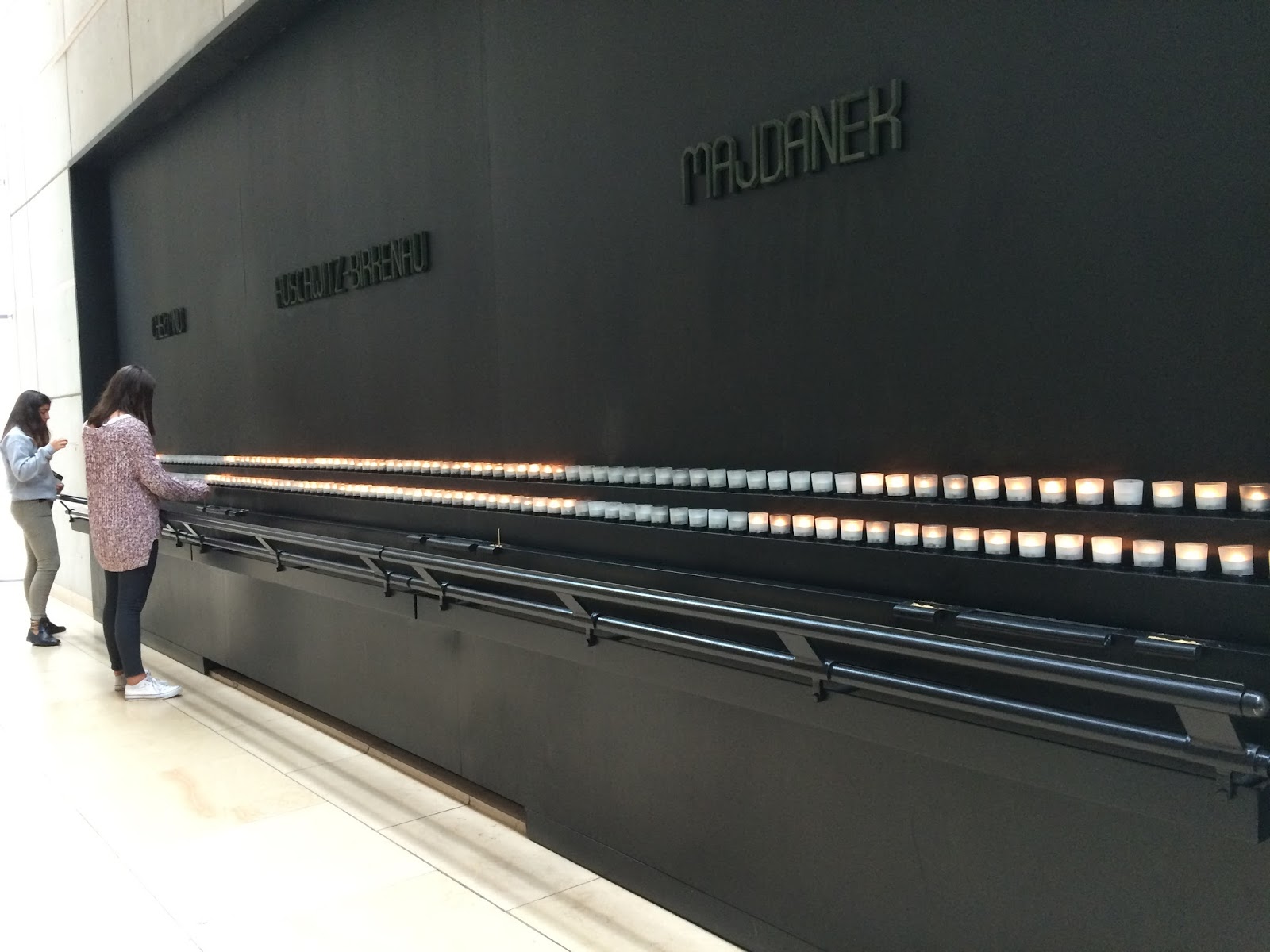 The upper circle walkway houses 6 black panels, one for each side of the hexagon. They are lined with rows of candles and inscribed with the names of the Concentration camps. The 6 Death camps have their own panels.