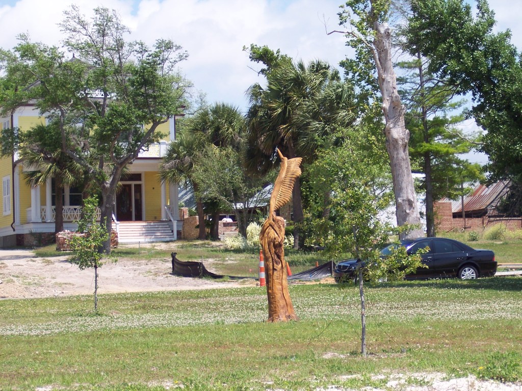 Well since I showed you the pictures of Biloxi in one of her worst moments, I though it only fair that I show her thriving also! These pictures are from my trip back to Biloxi in August 2007. I was only there for 2 weeks this time, but that was enough time to enjoy the city. The change was astonishing! Some things were still being repaired, but this time there was at least something to do! The first time I went everything was closed except the mall…the only thing to do was to volunteer in the clean up efforts. This time though a lot of the casino’s were opened back up, the beaches were open, the piers were rebuilt, the bridges rebuilt, the grass and trees were regrown, and it was beautiful again! The Hard Rock Casino was just built before Katrina hit. Their grand opening was actually supposed to be the weekend after Katrina, but they were a total loss. They rebuilt and were open when I went again. They salvaged some of the collection that was ruined in Katrina, and thay have the mangled pieces on display throughout the new casino, along with little descriptions of where the item was found after Katrina. It’s was very interesting…and sobering. The Beau Rivage is open and absolutely glorious! It stands where the Grand Hotel and Casino used to be….right where the freeeway comes into Biloxi. They have an awesome buffet if you ever get the chance to go. That was the first time I tried crab legs and crawdads…and no I did not suck the head! I drove the newly rebuilt bridge to Ocean Springs, and walked along the groomed beaches of Biloxi. There are still some remnants of Katrina, but not in the way you would think. A local artist took trees that were killed by Katrina and carved them into amazing sculptures that are now on display along Beach Blvd. Biloxi was shaken to her core after Katrina hit, but the city has a lot of heart and no amount of wind or rain is going to keep her down!