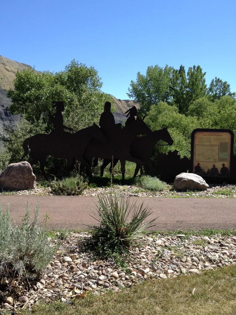 After coming back out of Glacier, we had decided on a day trip up to the northeast of Great Falls. We saw what looked like some interesting sights in a tourist magazine so decided to check them out and meet up with my sister Jen, who is in Conrad, at the same time. It was an interesting day! We made the trip to see the Upper Missouri River Breaks, not knowing that it was just a river and that much of the sights were only accessible from floating the river. We really wanted to see the “White Cliffs of the Missouri,” so the Ranger in the headquarters building directed us to a remote section of the river in which we could see some of the cliffs from the road. The road is 19 miles of dirt, ending in a “ferry” that crosses the Missouri in the middle of nowhere! Then another 10 or so miles of gravel road. It was insane! But so funny and unexpected that it was a blast and I think we will all remember it forever! The ferry was really just a floating barge that went back and forth across the river on a pulley system. It took about 10 minutes to go about 30 ft across river. Then on the other side of the river is an old mercantile, the Virgelle Mercantile. Really, it’s this awesome old building in the middle of nowhere by itself! There is no town…just some old cabins that they rent out, and a farm down the road a ways. The Merc housed an antique shop, which sold ice cream and offered kayak trips, and it doubled as a B&B. All-in-one I guess! They had a fire pit that had tractor seats as chairs! Wish I would have taken a picture of that! It was a fun, unexpected day, but next time I think we will check out the Gates of the Mountains instead!