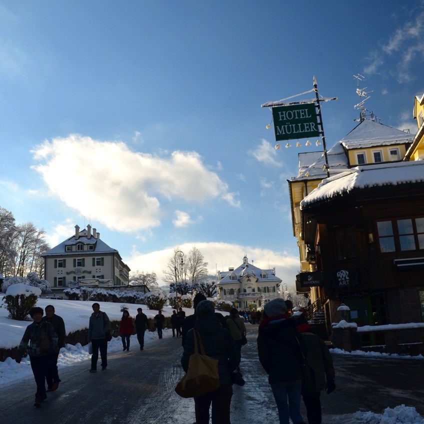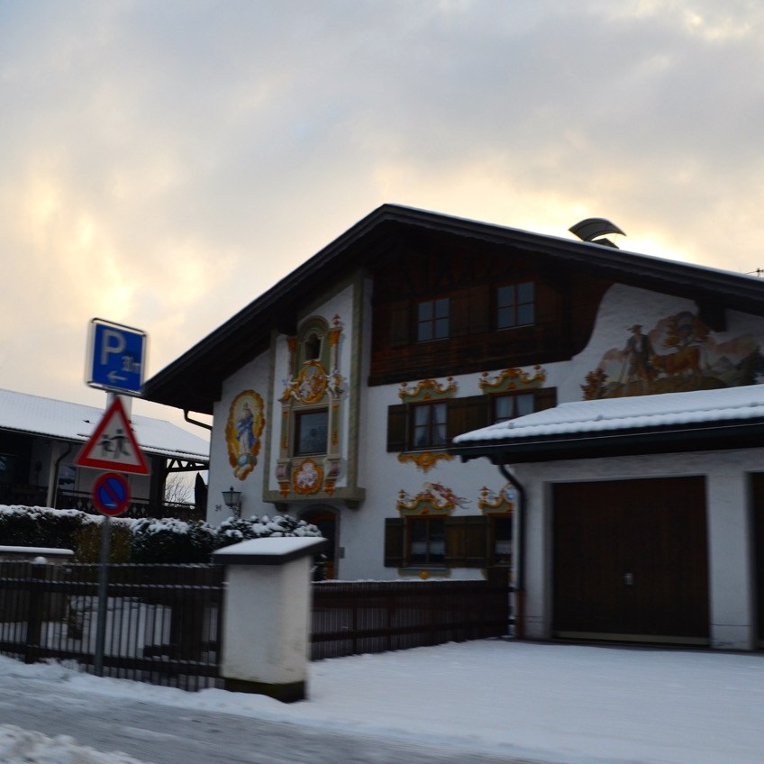 Since we were in Garmisch just one night, we decided to take a drive and see what we could of the town! We found the little “old town” area and it was so perfect! Fresh snow, greenery on the street lights, Christmas displays in windows….every store closed! Sunday. Well we drove around anyway, and took some pictures, before heading back to the hotel for the night. Another hard bed. They’re all hard. We slept ok though. This was probably my first decent night sleep on our trip! I didn’t wake up in the middle of the night wide awake, and it was awesome! The next morning, we had the breakfast. Oh, I should mention this! The hotel breakfasts in Germany consist of many kinds of meat…like lunch meat…and many kinds of cheese. They have a lot of breads, but not really pastries. More like croissants, bread, rolls, and the like. They’ll have a big bowl of flavored yogurt that you spoon out what you want, sometimes they have some sort of cereal, and they always have some kind of sausage, fake scrambled eggs, and some kind of potato! They were good, but I wasn’t sure if it was breakfast or lunch with the meat and cheese trays?? Brunch I guess! Oh, and coffee. German’s like coffee! And they like it to be very bitter! Just milk or cream, no sugar or sweetener! Ick! Luckily they drink it from very small cups, so I managed to swallow it down!