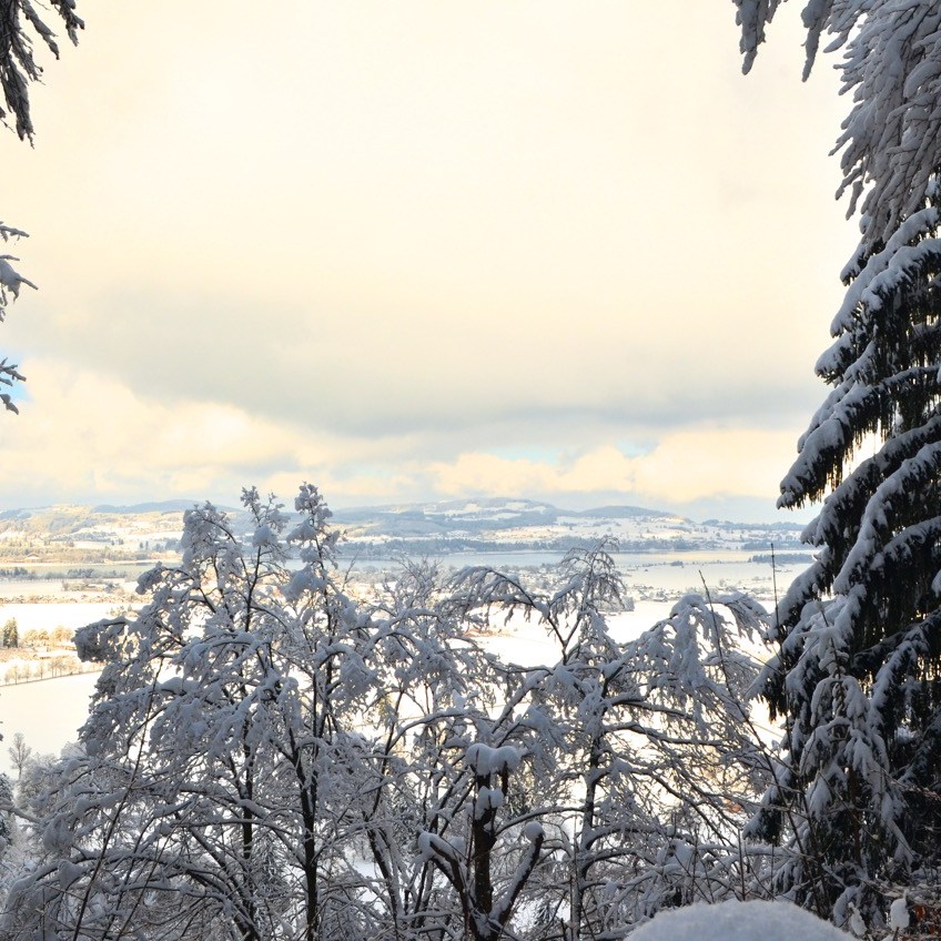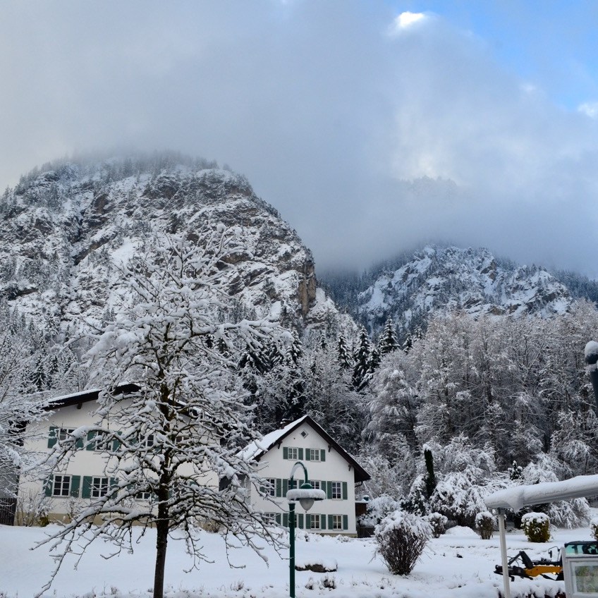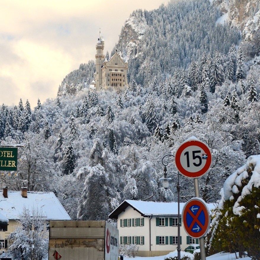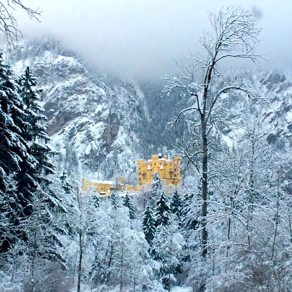 So after breakfast we decided to drive around town a bit before heading out. We found the Olympic ski jump that replaced the one used in the 1936 Winter Olympics. Why would anyone want to ski off that thing!? Wow! We were trying to waste some time waiting for a gift shop to open, but we finally decided to just go. So we headed out, bound for Hohenschwangau! The quickest way to get there from Garmisch is to cut through Austria, so that is precisely what we did! Even though we only got to see a tiny portion of Austria, I was still excited to add another country to the list on this trip! It seemed like we drove so much because we were in 5 countries and all over Germany! But really, the country of Germany is about the size of the state of Montana, so it really seems more than what it is. What we saw of Austria was so incredibly beautiful! High peaks towering over little snow covered villages! Perfect! You can see from the pictures, it had snowed the night before, so all the tree were freshly shrouded, and it was still cloudy and cold so the snow did not melt at all. It was so perfect! A winter wonderland! At the fairytale castle!! I couldn’t have planned a more perfect visit! The drive from Garmisch, through Austria, to Hohenschwangau took about an hour. It was a gorgeous drive through the freshly covered Bavarian Alps, and then you come around a curve and see the golden Schloss Hohenschwangau perched atop a hill directly in front of you. Wow! I was so excited to see it, and trying so hard to get a good picture, that it took me a moment to notice Schloss Neuschwanstein! It sits on the next mountain over. Both castles overlook the village of Hohenschwangau. I was in total awe!