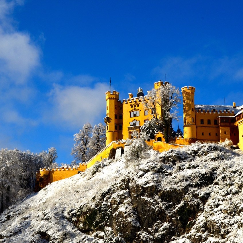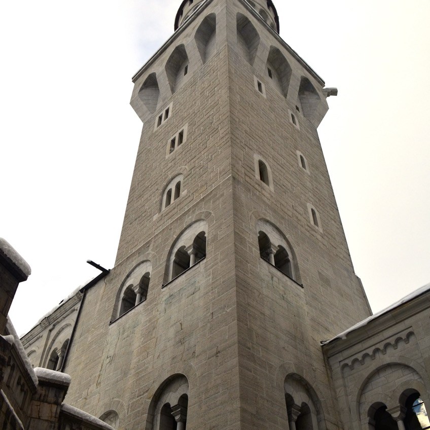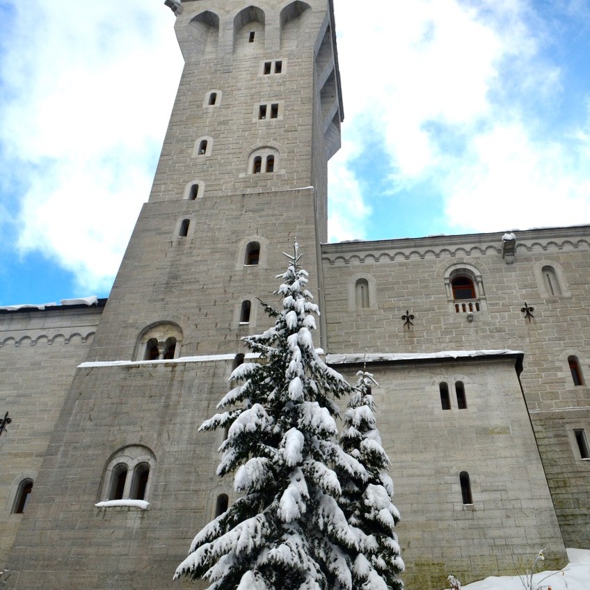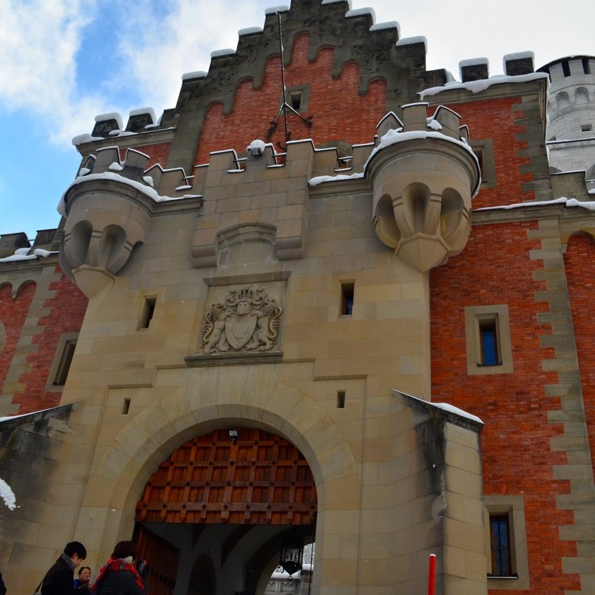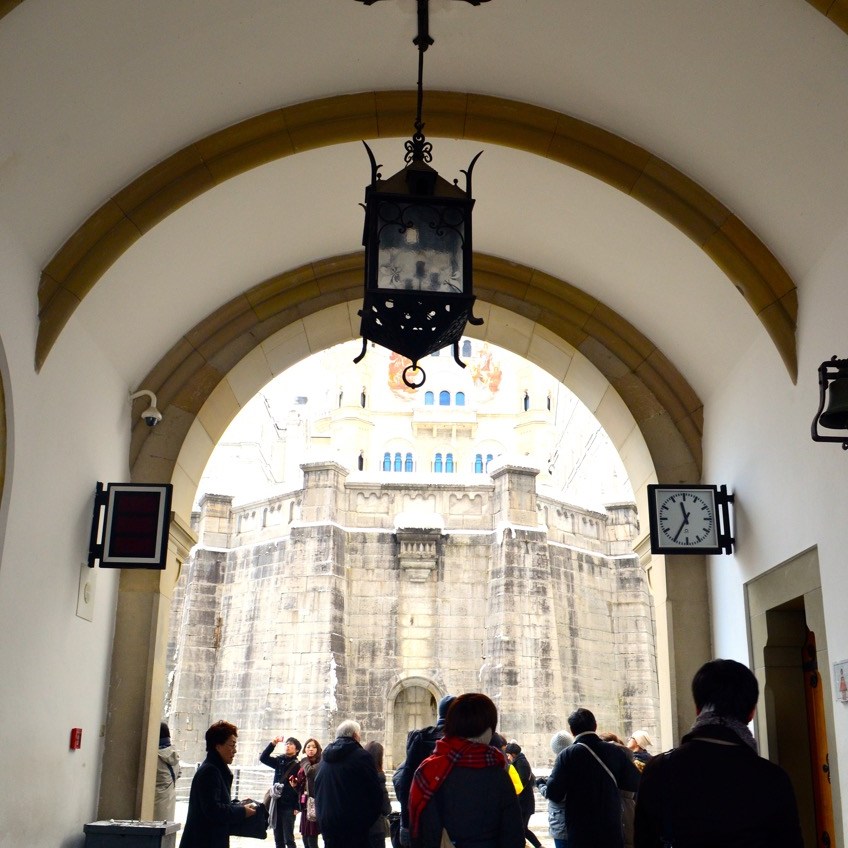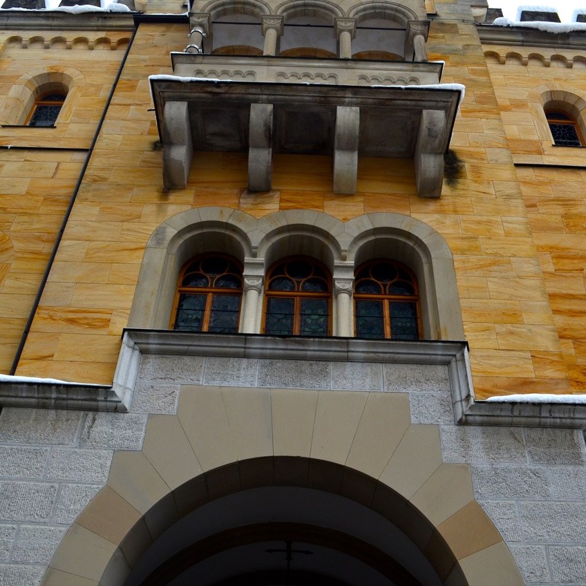 The front face of the castle is red brick, while the rest is the white stone. This was the entryway into the courtyard, where all of the tours began. There was a little hall with an information desk and some warm seating off to the side of the courtyard, and this was the only interior of the castle where photos were allowed. Bummer! No pictures. No video. However, if you Google “Neuschwanstein Castle” you will find some pictures of the inside. There will always be rule-breakers, but I am not one of them! Ok…some history; Neuschwanstein Castle stands where the old Hinter-Hohenschwangau castle once stood. The Schloss Hohenschwangau (the yellow one) was purchased by King Ludwig’s father, King Maximilian II, after it suffered severe damage and disrepair from not being used for over 200 years. He began the rebuilding of Schloss Hohenschwangau in 1832, and had 14 rooms completely refurbished by 1836. Those 14 rooms are available for tour. King Ludwig II was born in 1845 and spent most of his childhood in this castle. He grew up looking across the Pöllat Gorge where the ruins of Schloss Hinter-Hohenschwangau lay. He became the Crown King when his father passed away in 1864. The story goes that he was in his father’s study and came across some documents that showed his father had planned to purchase the old ruined castle across the gorge and build a new one. So King Ludwig did just that! He had his architect visit Schloss Wartburg in central Germany to make drawings of the ornamentation. King Ludwig had a passion for the Middle Ages, and wanted his castle to be built in the medieval style, but with the most modern technology and advances. So his castle had electricity to some rooms, and a telephone what would connect to town and to his other castle. He wanted to dedicate the castle to the arts, so each room is adorned with characters from operas and works of literature! There is only one spot in the entire castle where King Ludwig himself has any mark, and this is in the singer’s hall where his families coat of Arms is depicted in a mural on the wall with the inscription “Ludwig II, King of Bavaria, Count Palatine.”