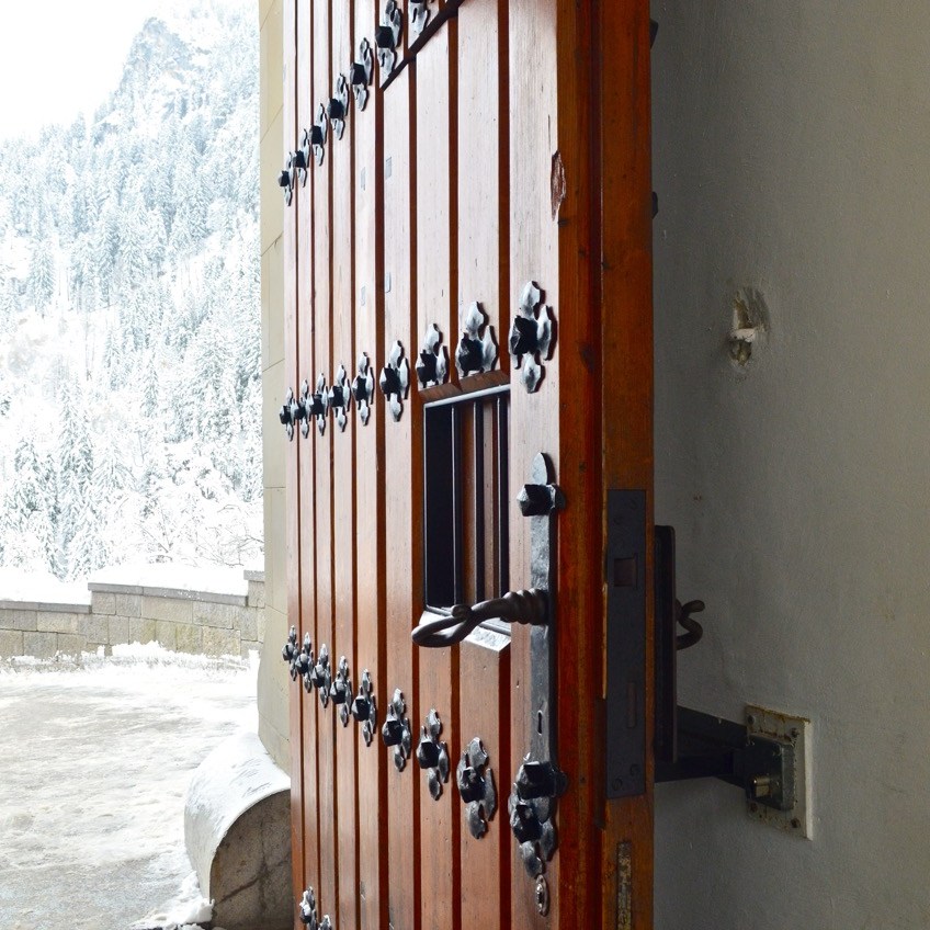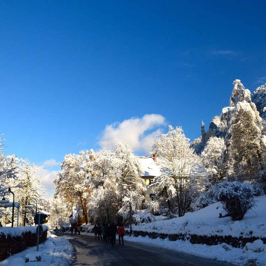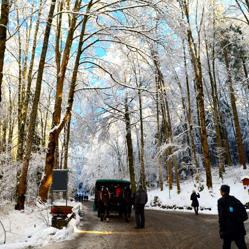 So the village of Hohenschwangau is a small touristy village. Of course it would be with two huge castles and a giant royal museum! It was rich in the traditional Bavarian architecture too, so of course I want to live there! Ha ha! We got to Hohenschwangau around 11am I think, and we bought tickets for the 11:55am English speaking tour of Schloss Neuschwanstein. Tours are offered of Schloss Hohenschwangau as well, but we were on a clock, so just toured Neuschwanstein. We will have to go back and tour Hohenschwangau, the museum of the Bavarian Kings, and the other area castles sometime! The walk to Neuschwanstein is about 40 minutes uphill. Well we had fresh snow and it was very cold, so we opted to take the horse-drawn carriage to the top. It wasn’t much quicker or warmer, but was drier. We got to where the horses let off and found that there was an additional walk up a steeper hill to get to the base of the castle. It was very short…only took about 10 minutes. Just below the base of the castle is the viewing platform. It’s a glass enclosed outcrop on the very edge of the rocks where you can get the best accessible vantage point of the front of the castle. Our tour was filled with Asian school kids…huh, English speaking tour is filled with Asians on a school field trip! I don’t know what country they might have been from, and I don’t want to attempt a guess, but I will say that they were the rudest bunch of tourists I have ever encountered! They don’t wait their turn…all turns are their turn. If you are next to stand in the perfect spot to take a picture, they will just come stand right in front of your camera to take their millionth selfie in one of 8 poses that they have perfected over time. It was so annoying!!! Anyway after all the teenagers cleared out, we got our turn in the the glass cage and took my pictures! From there, we walked the rest of the way to the base of the castle. Right next to it! I could touch it! And I did! And people were looking at me wondering why I was touching it! It was real, for real! lol!