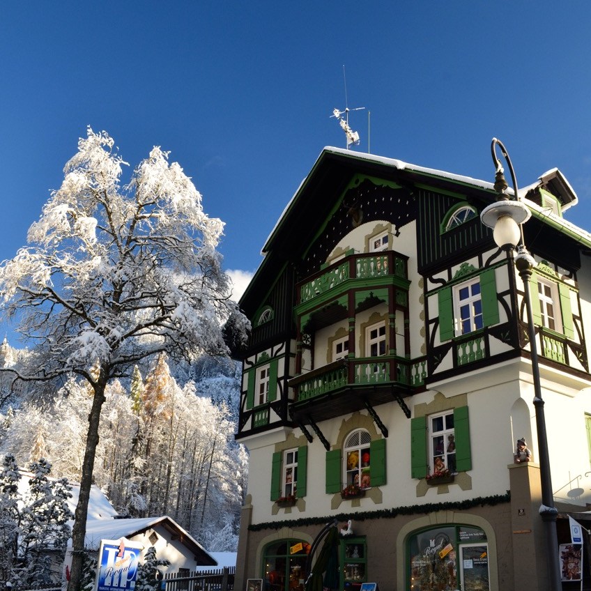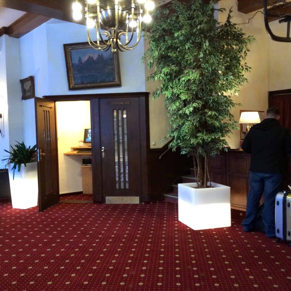 We got the car, programmed the hotel in the English speaking Garmin (thank you girl at the rental counter!) and headed to Garmisch! Garmisch is about an hour drive from Munich. The closer we got, the colder it got, and the more snow we saw! It was full dark by the time we got to the hotel, and about 0°C (freezing) and had stopped snowing…mostly. We checked into the Hotel Vier Jahreszeiten! This was a more traditional German hotel! I mean, the guy at the desk was wearing lederhosen! How much more authentic can you be!?? The hotel was very quaint! It had all the modern amenities like wi-fi, mini-bar, cable tv, breakfast….but it was still very unique to itself and old-fashioned! The elevator was tiny…and old! Our room opened with a REAL key! Not one of those magnetic cards! And the desk was not manned 24/7. They left at 9pm and your room key would open the front door. I was very skeptical at first with this hotel, but it turned out to be wonderful! And, coincidently, we discovered it was the same hotel that Lisa and Mike stayed at the last time they were in Garmisch! Funny! The night and morning desk clerks were very friendly! I would guess they are a married couple who own the hotel. They didn’t speak very much English though! (That’s how you know it’s authentic….if it were touristy, they would speak better English! ;)) They assumed by our name, that Jeremy spoke German. Jeremy said “mein Deutsch nein gut” and the guy said, “but your last name is German, yes?” lol! Jeremy got that assumption a few times I think!