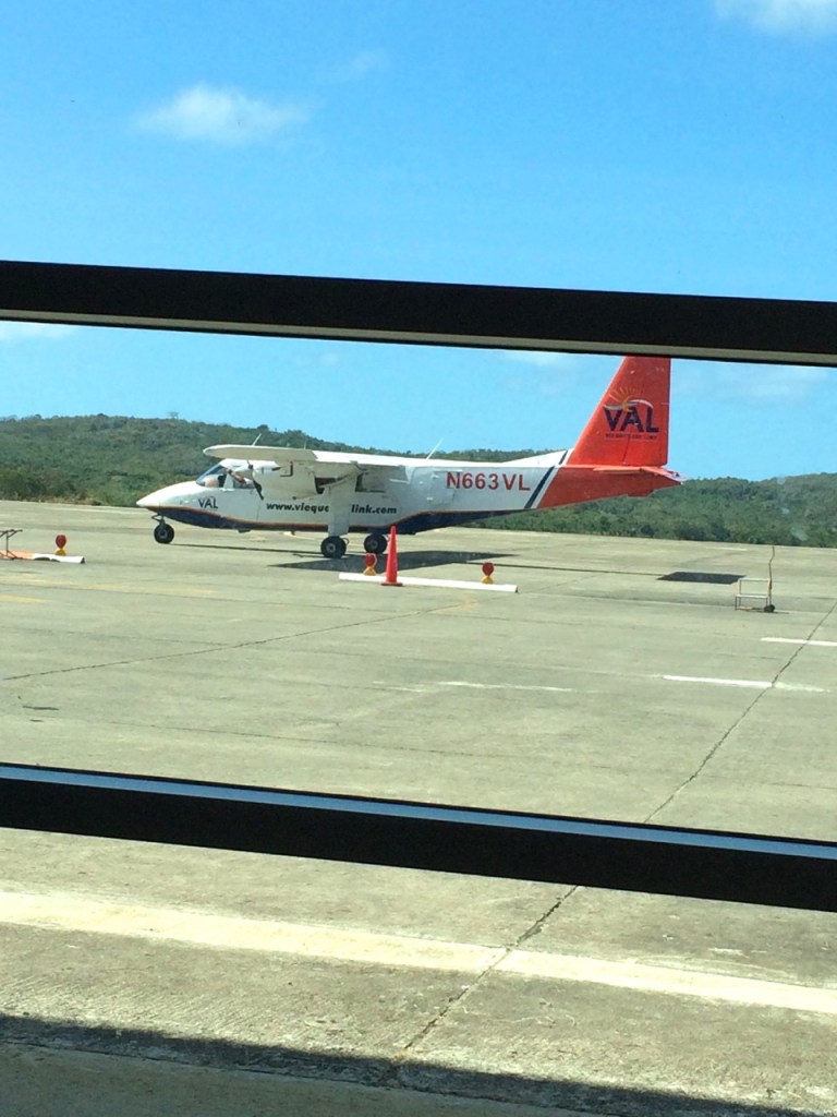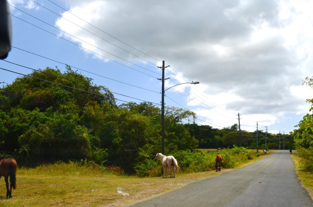 The next day and a half was spent on the small island of Vieques. Vieques lies about 8 miles to the east of Puerto Rico. We had to take a little prop plane to get there. A little 8-seater, no bag check, no security check, 10-minute flight. Two of the main things I wanted to do on our trip was to see the Caribbean Sea, and to see a bioluminescent bay. As soon as I found out that PR had bioluminescent bays, I HAD to see one. And when I discovered that the brightest one in the world was the one on Vieques, well….decision made! Vieques is a tiny island surrounded by reef. There are 2 towns, one on the north and one on the south. Really though, the island is 4 miles wide so they aren’t that far apart! We stayed in Esperanza in the south, which is where most of the tourists stay. The island is very laid back and natural. It used to be a Naval Station so was never commercialized. Once the Navy vacated, it became a tourist haven. There are some remains from the Navy. Like the beach names…black beach, red beach, green beach…and there are some old bunkers and radar equipment. The islands local inhabitants include wild horses roaming the streets where ever they want. Kind of odd to drive up on a heard of horses!